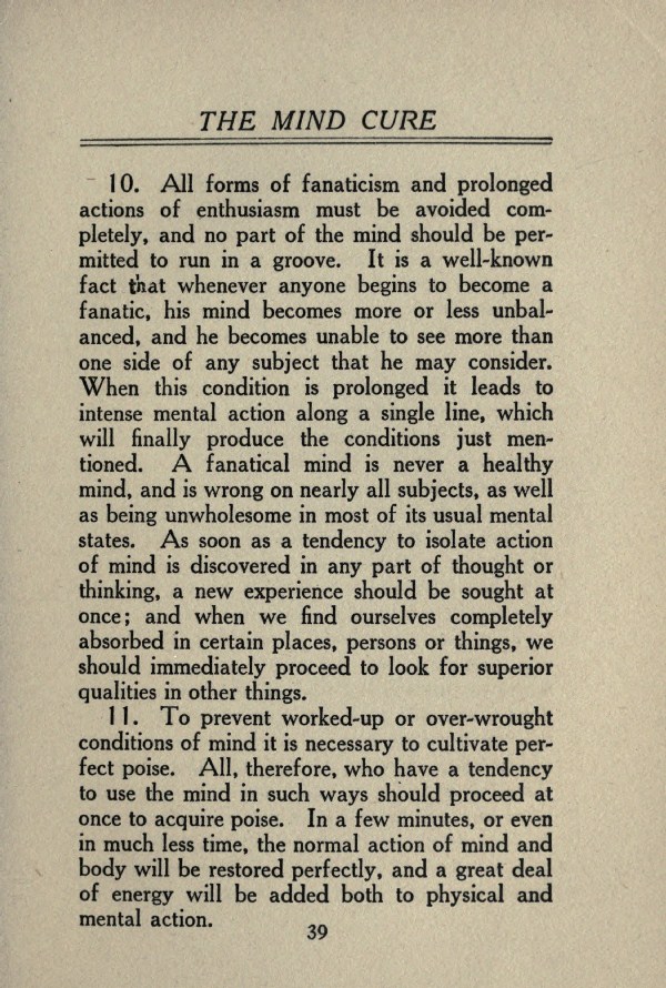 10. All forms of fanaticism and prolonged actions of enthusiasm must be avoided completely, and no part of the mind should be permitted to run in a groove. It is a well-known fact that whenever anyone begins to become a fanatic, his mind becomes more or less unbalanced, and he becomes unable to see more than one side of any subject that he may consider. When this condition is prolonged it leads to intense mental action along a single line, which will finally produce the conditions just mentioned. A fanatical mind is never a healthy mind, and is wrong on nearly all subjects, as well as being unwholesome in most of its usual mental states. As soon as a tendency to isolate action of mind is discovered in any part of thought or thinking, a new experience should be sought at once; and when we find ourselves completely absorbed in certain places, persons or things, we should immediately proceed to look for superior qualities in other things.