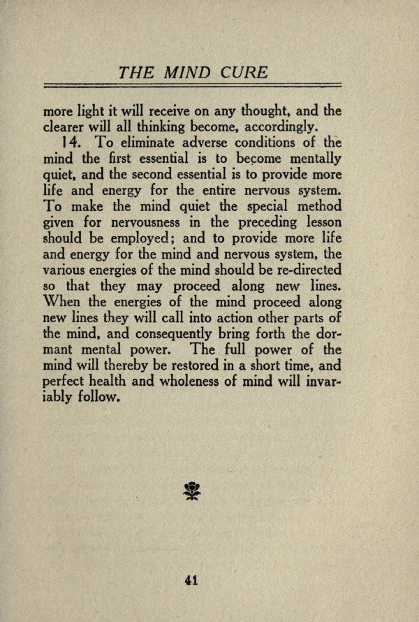 14. To eliminate adverse conditions of the mind the first essential is to become mentally quiet, and the second essential is to provide more life and energy for the entire nervous system. To make the mind quiet the special method given for nervousness in the preceding lesson should be employed; and to provide more life and energy for the mind and nervous system, the various energies of the mind should be re-directed so that they may proceed along new lines. When the energies of the mind proceed along new lines they will call into action other parts of the mind, and consequently bring forth the dormant mental power. The full power of the mind will thereby be restored in a short time, and perfect health and wholeness of mind will invariably follow.