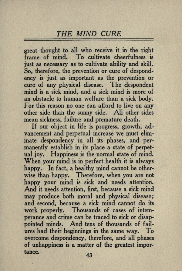 If our object in life is progress, growth, advancement and perpetual increase we must eliminate despondency in all its phases, and permanently establish in its place a state of perpetual joy. Happiness is the normal state of mind. When your mind is in perfect health it is always happy. In fact, a healthy mind cannot be otherwise than happy. Therefore, when you are not happy your mind is sick and needs attention. And it needs attention, first, because a sick mind may produce both moral and physical disease; and second, because a sick mind cannot do its work properly. Thousands of cases of intemperance and crime can be traced to sick or disappointed minds. And tens of thousands of failures had their beginnings in the same way. To overcome despondency, therefore, and all phases of unhappiness is a matter of the greatest importance.
