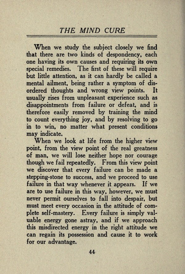 When we study the subject closely we find that there are two kinds of despondency, each one having its own causes and requiring its own special remedies. The first of these will require but little attention, as it can hardly be called a mental ailment, being rather a symptom of disordered thoughts and wrong view points. It usually rises from unpleasant experience such as disappointments from failure or defeat, and is therefore easily removed by training the mind to count everything joy, and by resolving to go in to win, no matter what present conditions may indicate.