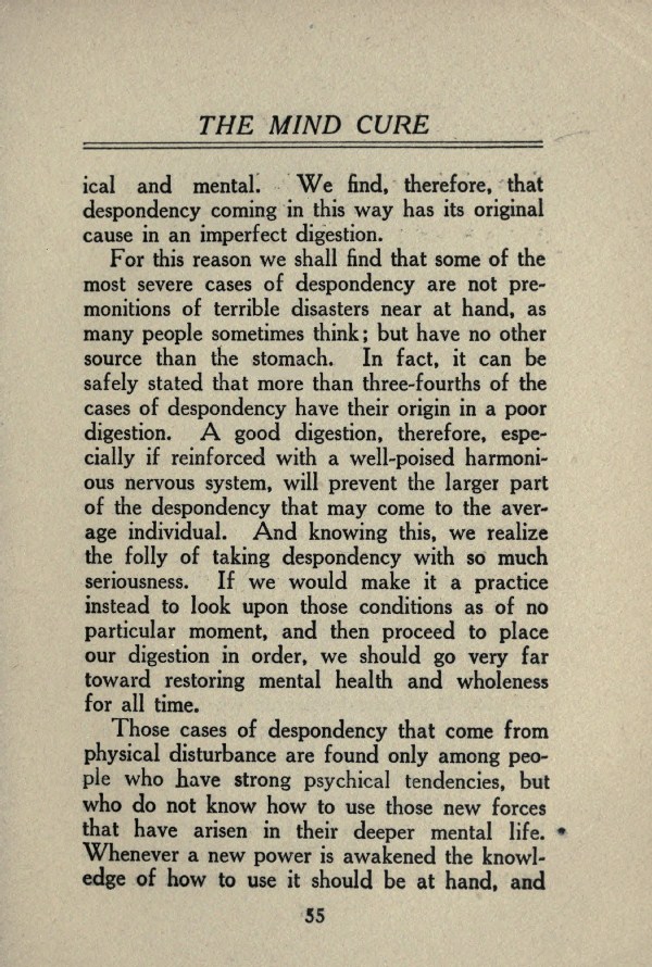For this reason we shall find that some of the most severe cases of despondency are not premonitions of terrible disasters near at hand, as many people sometimes think; but have no other source than the stomach. In fact, it can be safely stated that more than three-fourths of the cases of despondency have their origin in a poor digestion. A good digestion, therefore, especially if reinforced with a well-poised harmonious nervous system, will prevent the larger part of the despondency that may come to the average individual. And knowing this, we realize the folly of taking despondency with so much seriousness. If we would make it a practice instead to look upon those conditions as of no particular moment, and then proceed to place our digestion in order, we should go very far toward restoring mental health and wholeness for all time.