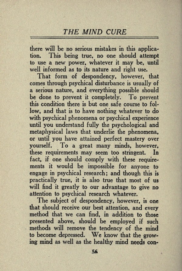 That form of despondency, however, that comes through psychical disturbance is usually of a serious nature, and everything possible should be done to prevent it completely. To prevent this condition there is but one safe course to follow, and that is to have nothing whatever to do with psychical phenomena or psychical experience until you understand fully the psychological and metaphysical laws that underlie the phenomena, or until you have attained perfect mastery over yourself. To a great many minds, however, these requirements may seem too stringent. In fact, if one should comply with these requirements it would be impossible for anyone to engage in psychical research; and though this is practically true, it is also true that most of us will find it greatly to our advantage to give no attention to psychical research whatever.