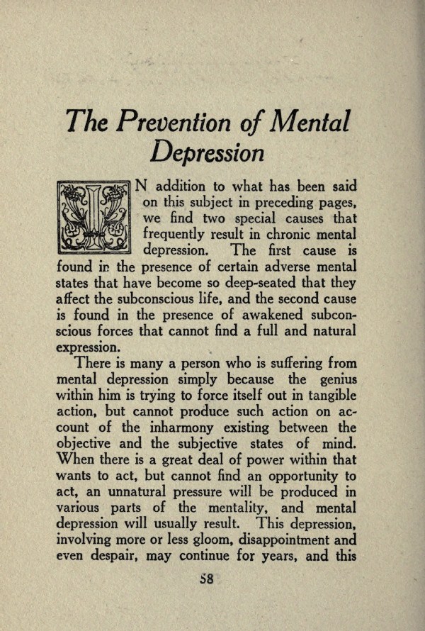 IN addition to what has been said on this subject in preceding pages, we find two special causes that frequently result in chronic mental depression. The first cause is found in the presence of certain adverse mental states that have become so deep-seated that they affect the subconscious life, and the second cause is found in the presence of awakened subconscious forces that cannot find a full and natural expression.