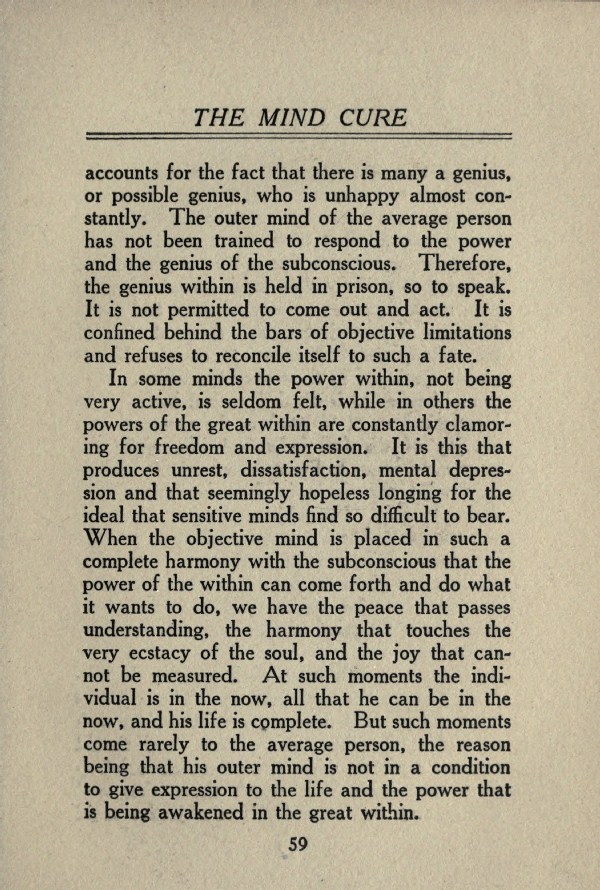 In some minds the power within, not being very active, is seldom felt, while in others the powers of the great within are constantly clamoring for freedom and expression. It is this that produces unrest, dissatisfaction, mental depression and that seemingly hopeless longing for the ideal that sensitive minds find so difficult to bear. When the objective mind is placed in such a complete harmony with the subconscious that the power of the within can come forth and do what it wants to do, we have the peace that passes understanding, the harmony that touches the very ecstacy of the soul, and the joy that cannot be measured. At such moments the individual is in the now, all that he can be in the now, and his life is complete. But such moments come rarely to the average person, the reason being that his outer mind is not in a condition to give expression to the life and the power that is being awakened in the great within.