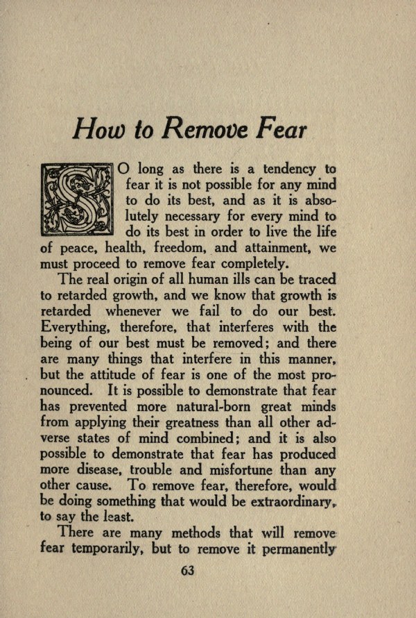 The real origin of all human ills can be traced to retarded growth, and we know that growth is retarded whenever we fail to do our best. Everything, therefore, that interferes with the being of our best must be removed; and there are many things that interfere in this manner, but the attitude of fear is one of the most pronounced. It is possible to demonstrate that fear has prevented more natural-born great minds from applying their greatness than all other adverse states of mind combined; and it is also possible to demonstrate that fear has produced more disease, trouble and misfortune than any other cause. To remove fear, therefore, would be doing something that would be extraordinary, to say the least.