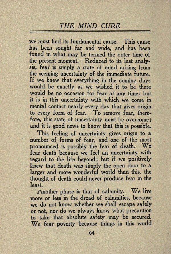 we must find its fundamental cause. This cause has been sought far and wide, and has been found in what may be termed the outer time of the present moment. Reduced to its last analysis, fear is simply a state of mind arising from the seeming uncertainty of the immediate future. If we knew that everything in the coming days would be exactly as we wished it to be there would be no occasion for fear at any time; but it is in this uncertainty with which we come in mental contact nearly every day that gives origin to every form of fear. To remove fear, therefore, this state of uncertainty must be overcome; and it is good news to know that this is possible.
