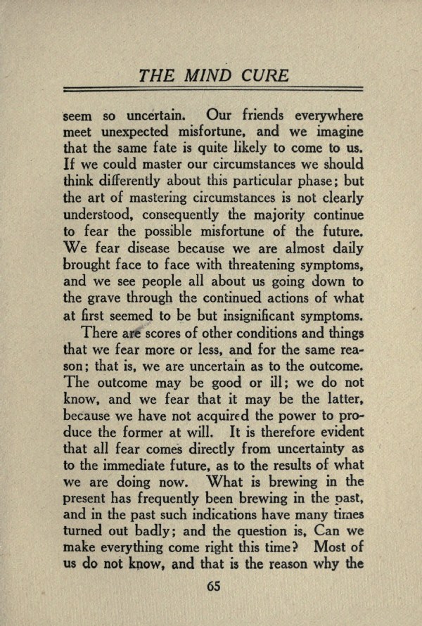 seem so uncertain. Our friends everywhere meet unexpected misfortune, and we imagine that the same fate is quite likely to come to us. If we could master our circumstances we should think differently about this particular phase; but the art of mastering circumstances is not clearly understood, consequently the majority continue to fear the possible misfortune of the future. We fear disease because we are almost daily brought face to face with threatening symptoms, and we see people all about us going down to the grave through the continued actions of what at first seemed to be but insignificant symptoms. There are scores of other conditions and things that we fear more or less, and for the same reason; that is, we are uncertain as to the outcome. The outcome may be good or ill; we do not know, and we fear that it may be the latter, because we have not acquired the power to produce the former at will. It is therefore evident that all fear comes directly from uncertainty as to the immediate future, as to the results of what we are doing now. What is brewing in the present has frequently been brewing in the past, and in the past such indications have many times turned out badly; and the question is. Can we make everything come right this time? Most of us do not know, and that is the reason why the