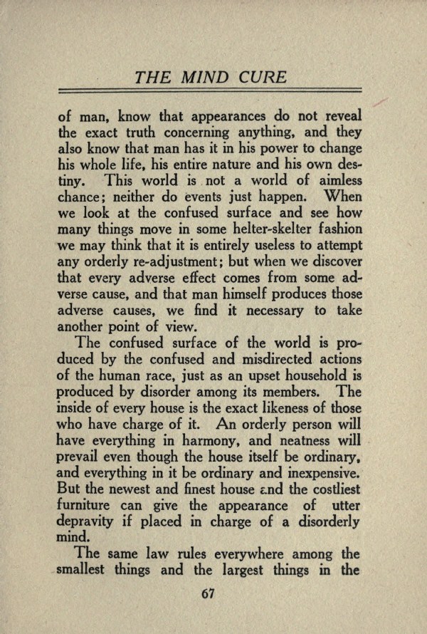 The confused surface of the world is produced by the confused and misdirected actions of the human race, just as an upset household is produced by disorder among its members. The inside of every house is the exact likeness of those who have charge of it. An orderly person will have everything in harmony, and neatness will prevail even though the house itself be ordinary, and everything in it be ordinary and inexpensive. But the newest and finest house .nd the costliest furniture can give the appearance of utter depravity if placed in charge of a disorderly mind.
