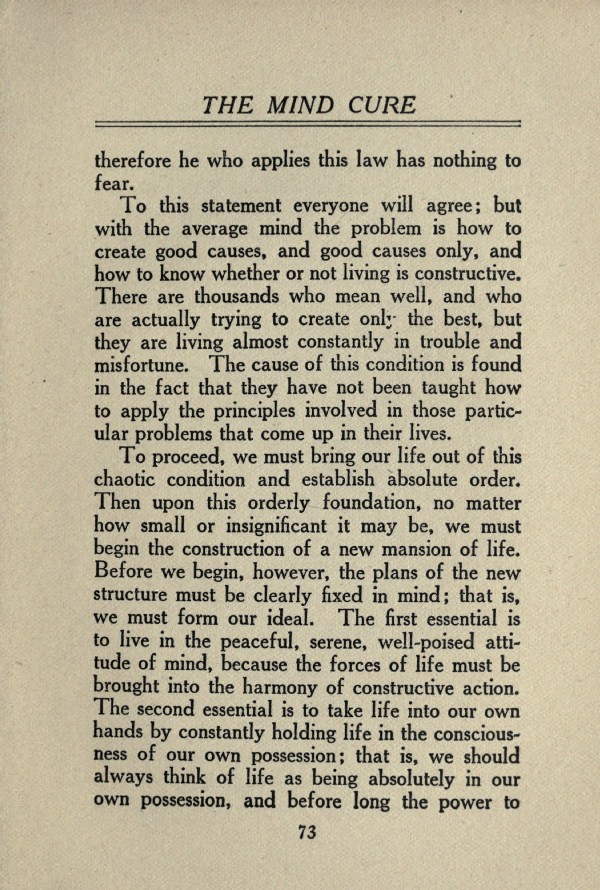 To proceed, we must bring our life out of this chaotic condition and establish absolute order. Then upon this orderly foundation, no matter how small or insignificant it may be, we must begin the construction of a new mansion of life. Before we begin, however, the plans of the new structure must be clearly fixed in mind; that is, we must form our ideal. The first essential is to live in the peaceful, serene, well-poised attitude of mind, because the forces of life must be brought into the harmony of constructive action. The second essential is to take life into our own hands by constantly holding life in the consciousness of our own possession; that is, we should always think of life as being absolutely in our own possession, and before long the power to