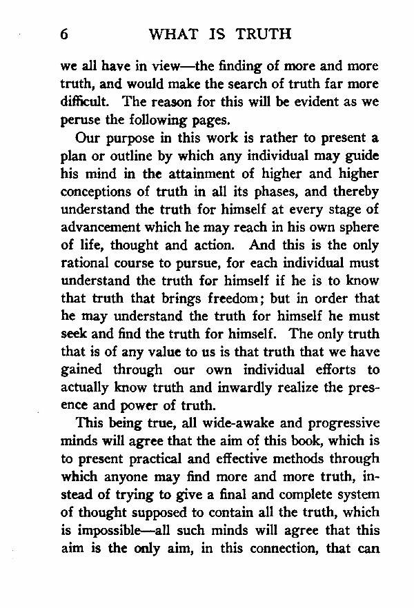 Our purpose in this work is rather to present a plan or outline by which any individual may guide his mind in the attainment of higher and higher conceptions of truth in all its phases, and thereby understand the truth for himself at every stage of advancement which he may reach in his own sphere of life, thought and action. And this is the only rational course to pursue, for each individual must understand the truth for himself if he is to know that truth that brings freedom; but in order that he may understand the truth for himself he must seek and find the truth for himself. The only truth that is of any value to us is that truth that we have gained through our own individual efforts to actually know truth and inwardly realize the presence and power of truth.