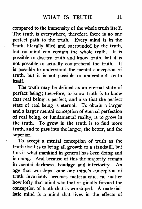 The truth may be defined as an eternal state of perfect being; therefore, to know truth is to know that real being is perfect, and also that the perfect state of real being is eternal. To obtain a larger and a larger mental conception of eternal perfection of real being, or fundamental reality, is to grow in the truth. To grow in the truth is to find more truth, and to pass into the larger, the better, and the superior.