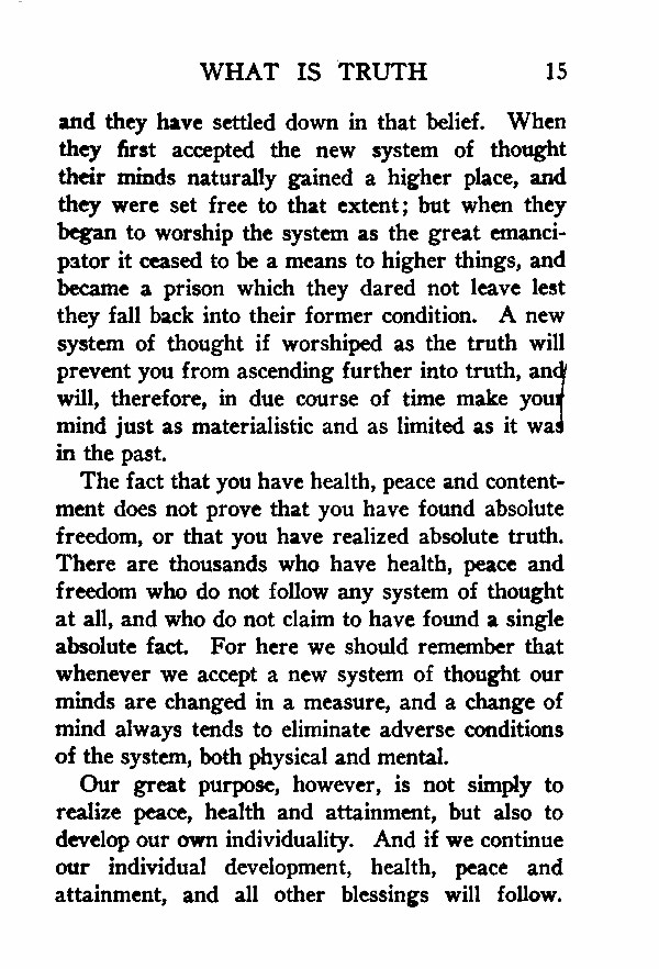 The fact that you have health, peace and contentment does not prove that you have found absolute freedom, or that you have realized absolute truth. There are thousands who have health, peace and freedom who do not follow any system of thought at all, and who do not claim to have found a single absolute fact. For here we should remember that whenever we accept a new system of thought our minds are changed in a measure, and a change of mind always tends to eliminate adverse conditions of the system, both physical and mental.