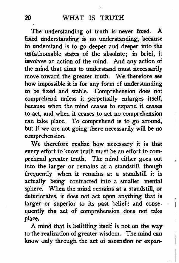 We therefore realize how necessary it is that every effort to know truth must be an effort to comprehend greater truth. The mind either goes out into the larger or remains at a standstill, though frequently when it remains at a standstill it is actually being contracted into a smaller mental sphere. When the mind remains at a standstill, or deteriorates, it does not act upon anything that is larger or superior to its past belief; and consequently the act of comprehension does not take place.