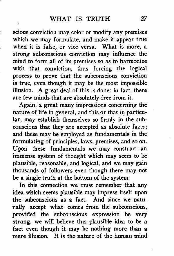 Again, a great many impressions concerning the nature of life in general, and this or that in particular, may establish themselves so firmly in the subconscious that they are accepted as absolute facts; and these may be employed as fundamentals in the formulating of principles, laws, premises, and so on. Upon these fundamentals we may construct an immense system of thought which may seem to be plausible, reasonable, and logical, and we may gain thousands of followers even though there may not be a single truth at the bottom of the system.