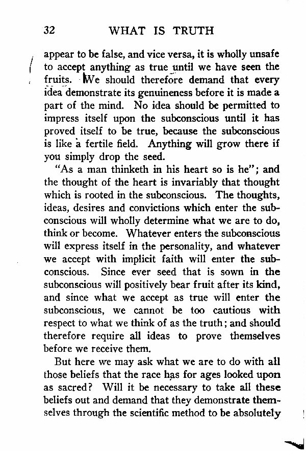 "As a man thinketh in his heart so is he"; and the thought of the heart is invariably that thought which is rooted in the subconscious. The thoughts, ideas, desires and convictions which enter the subconscious will wholly determine what we are to do, think or become. Whatever enters the subconscious will express itself in the personality, and whatever we accept with implicit faith will enter the subconscious. Since ever seed that is sown in the subconscious will positively bear fruit after its kind, and since what we accept as true will enter the subconscious, we cannot be too cautious with respect to what we think of as the truth; and should therefore require all ideas to prove themselves before we receive them.