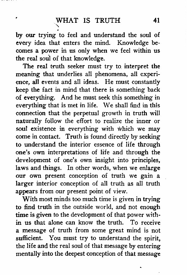 The real truth seeker must try to interpret the meaning that underlies all phenomena, all experience, all events and all ideas. He must constantly keep the fact in mind that there is something back of everything. And he must seek this something in everything that is met in life. We shall find in this connection that the perpetual growth in truth will naturally follow the effort to realize the inner or soul existence in everything with which we may come in contact. Truth is found directly by seeking to understand the interior essence of life through one's own interpretations of life and through the development of one's own insight into principles, laws and things. In other words, when we enlarge our own present conception of truth we gain a larger interior conception of all truth as all truth appears from our present point of view.