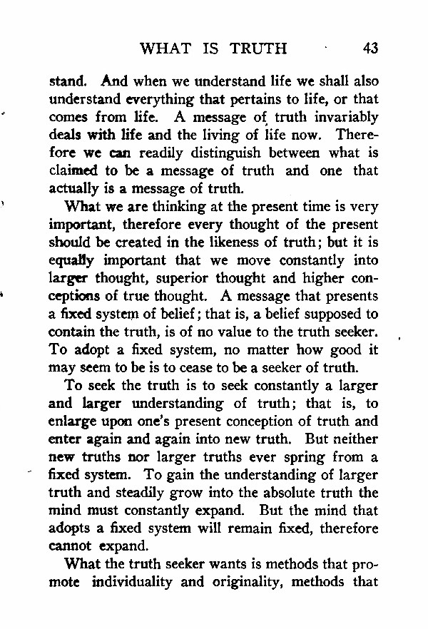 To seek the truth is to seek constantly a larger and larger understanding of truth; that is, to enlarge upon one's present conception of truth and enter again and again into new truth. But neither new truths nor larger truths ever spring from a fixed system. To gain the understanding of larger truth and steadily grow into the absolute truth the mind must constantly expand. But the mind that adopts a fixed system will remain fixed, therefore cannot expand.