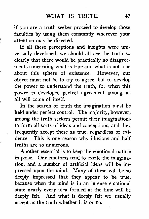 In the search of truth the imagination must be held under perfect control. The majority, however, among the truth seekers permit their imaginations to form all sorts of ideas and conceptions, and they frequently accept these as true, regardless of evidence. This is one reason why illusions and half truths are so numerous.