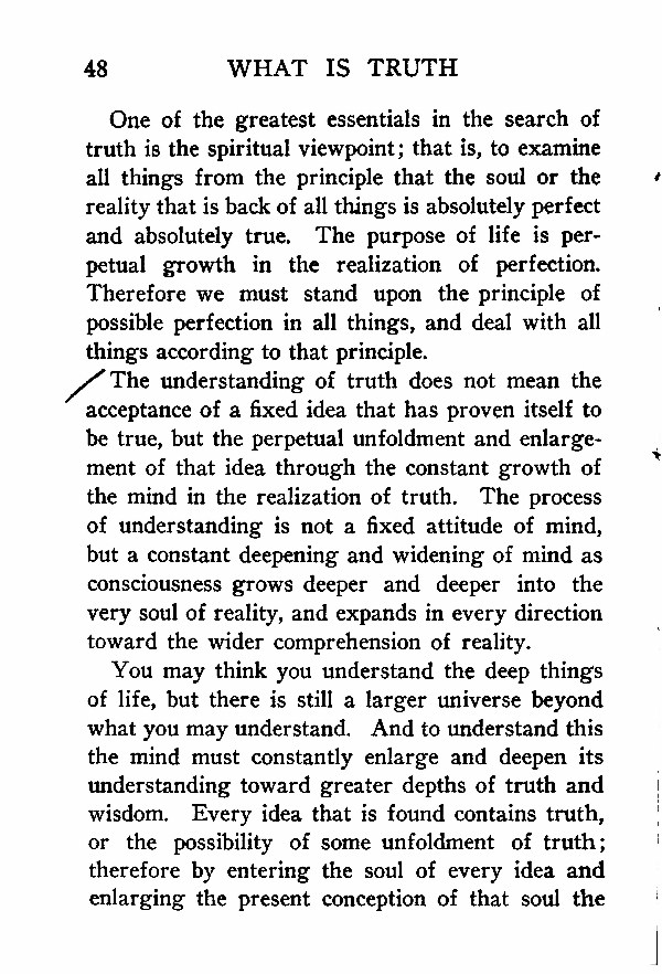One of the greatest essentials in the search of truth is the spiritual viewpoint; that is, to examine all things from the principle that the soul or the reality that is back of all things is absolutely perfect and absolutely true. The purpose of life is perpetual growth in the realization of perfection. Therefore we must stand upon the principle of possible perfection in all things, and deal with all things according to that principle. The understanding of truth does not mean the acceptance of a fixed idea that has proven itself to be true, but the perpetual unfoldment and enlargement of that idea through the constant growth of the mind in the realization of truth. The process of understanding is not a fixed attitude of mind, but a constant deepening and widening of mind as consciousness grows deeper and deeper into the very soul of reality, and expands in every direction toward the wider comprehension of reality.