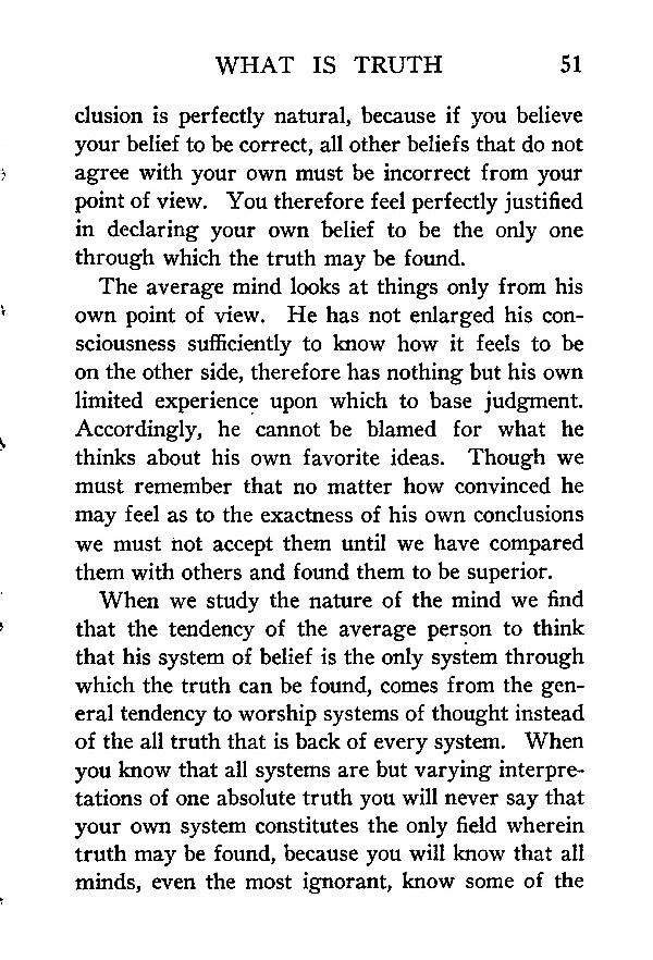 When we study the nature of the mind we find that the tendency of the average person to think that his system of belief is the only system through which the truth can be found, comes from the general tendency to worship systems of thought instead of the all truth that is back of every system. When you know that all systems are but varying interpretations of one absolute truth you will never say that your own system constitutes the only field wherein truth may be found, because you will know that all minds, even the most ignorant, know some of the
