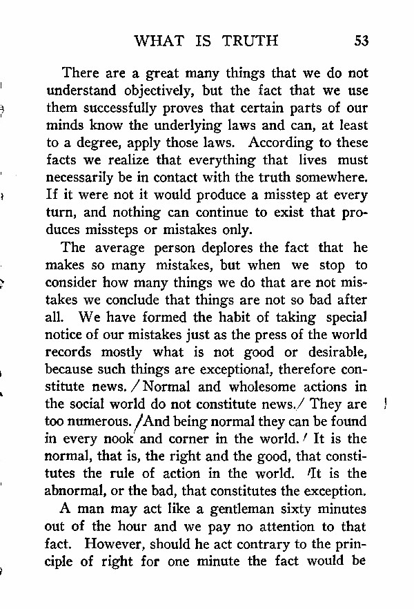 The average person deplores the fact that he makes so many mistakes, but when we stop to consider how many things we do that are not mistakes we conclude that things are not so bad after all. We have formed the habit of taking special notice of our mistakes just as the press of the world records mostly what is not good or desirable, because such things are exceptional, therefore constitute news. Normal and wholesome actions in the social world do not constitute news. They are too numerous. And being normal they can be found in every nook and corner in the world. It is the normal, that is, the right and the good, that constitutes the rule of action in the world. It is the abnormal, or the bad, that constitutes the exception.