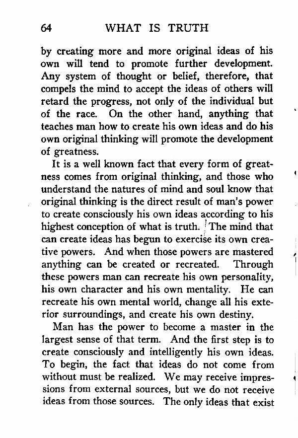 It is a well known fact that every form of greatness comes from original thinking, and those who understand the natures of mind and soul know that original thinking is the direct result of man's power to create consciously his own ideas according to his highest conception of what is truth. < The mind that can create ideas has begun to exercise its own creative powers. And when those powers are mastered anything can be created or recreated. Through these powers man can recreate his own personality, his own character and his own mentality. He can recreate his own mental world, change all his exterior surroundings, and create his own destiny.