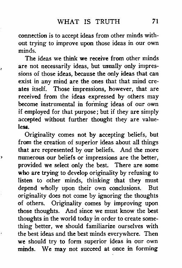 The ideas we think we receive from other minds are not necessarily ideas, but usually only impressions of those ideas, because the only ideas that can exist in any mind are the ones that that mind creates itself. Those impressions, however, that are received from the ideas expressed by others may become instrumental in forming ideas of our own if employed for that purpose; but if they are simply accepted without further thought they are valueless.