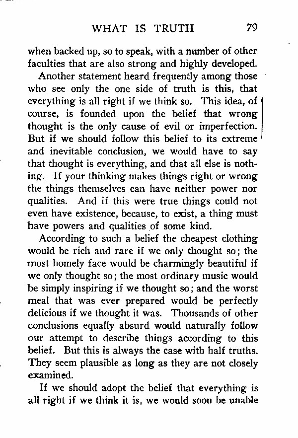Another statement heard frequently among those who see only the one side of truth is this, that everything is all right if we think so. This idea, of course, is founded upon the belief that wrong thought is the only cause of evil or imperfection. But if we should follow this belief to its extreme and inevitable conclusion, we would have to say that thought is everything, and that all else is nothing. If your thinking makes things right or wrong the things themselves can have neither power nor qualities. And if this were true things could not even have existence, because, to exist, a thing must have powers and qualities of some kind.