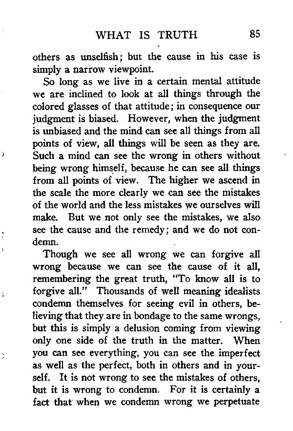 So long as we live in a certain mental attitude we are inclined to look at all things through the colored glasses of that attitude; in consequence our judgment is biased. However, when the judgment is unbiased and the mind can see all things from all points of view, all things will be seen as they are. Such a mind can see the wrong in others without being wrong himself, because he can see all things from all points of view. The higher we ascend in the scale the more clearly we can see the mistakes of the world and the less mistakes we ourselves will make. But we not only see the mistakes, we also see the cause and the remedy; and we do not condemn.