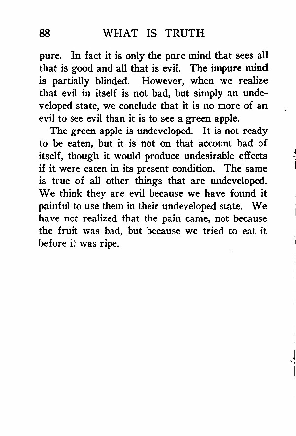 The green apple is undeveloped. It is not ready to be eaten, but it is not on that account bad of itself, though it would produce undesirable effects if it were eaten in its present condition. The same is true of all other things that are undeveloped. We think they are evil because we have found it painful to use them in their undeveloped state. We have not realized that the pain came, not because the fruit was bad, but because we tried to eat it before it was ripe.