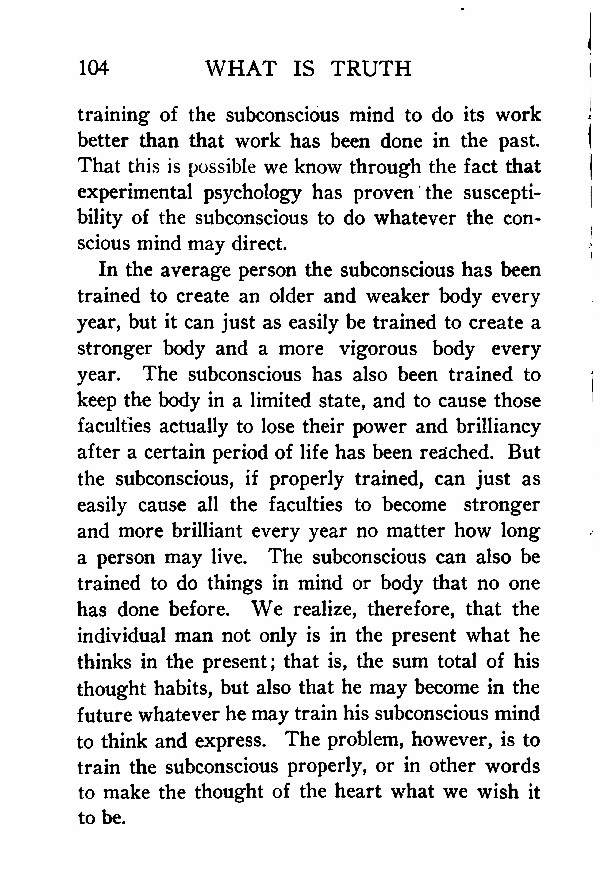 In the average person the subconscious has been trained to create an older and weaker body every year, but it can just as easily be trained to create a stronger body and a more vigorous body every year. The subconscious has also been trained to keep the body in a limited state, and to cause those faculties actually to lose their power and brilliancy after a certain period of life has been reached. But the subconscious, if properly trained, can just as easily cause all the faculties to become stronger and more brilliant every year no matter how long a person may live. The subconscious can also be trained to do things in mind or body that no one has done before. We realize, therefore, that the individual man not only is in the present what he thinks in the present; that is, the sum total of his thought habits, but also that he may become in the future whatever he may train his subconscious mind to think and express. The problem, however, is to train the subconscious properly, or in other words to make the thought of the heart what we wish it to be.