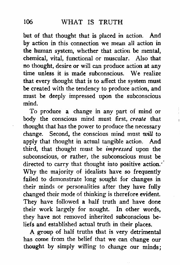 To produce a change in any part of mind or body the conscious mind must first, create that thought that has the power to produce the necessary change. Second, the conscious mind must will to apply that thought in actual tangible action. And third, that thought must be impressed upon the subconscious, or rather, the subconscious must be directed to carry that thought into positive action.' Why the majority of idealists have so frequently failed to demonstrate long sought for changes in their minds or personalities after they have fully changed their mode of thinking is therefore evident. They have followed a half truth and have done their work largely for nought. In other words, they have not removed inherited subconscious beliefs and established actual truth in their places.