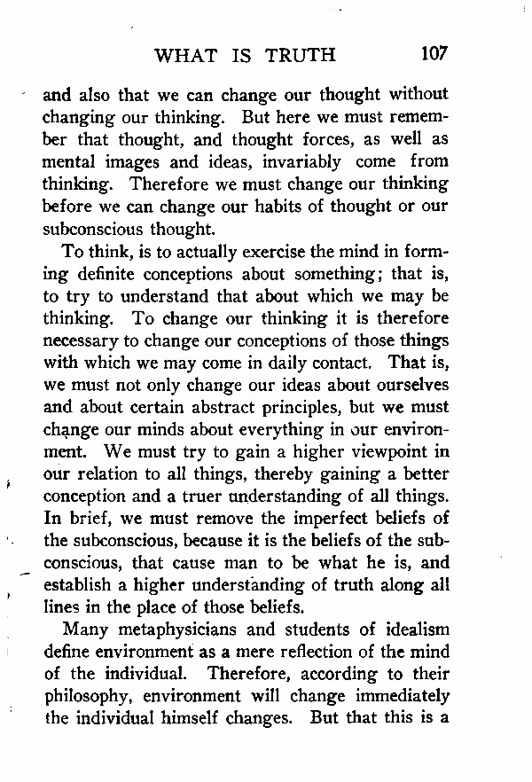 To think, is to actually exercise the mind in forming definite conceptions about something; that is, to try to understand that about which we may be thinking. To change our thinking it is therefore necessary to change our conceptions of those things with which we may come in daily contact. That is, we must not only change our ideas about ourselves and about certain abstract principles, but we must change our minds about everything in our environment. We must try to gain a higher viewpoint in our relation to all things, thereby gaining a better conception and a truer understanding of all things. In brief, we must remove the imperfect beliefs of the subconscious, because it is the beliefs of the subconscious, that cause man to be what he is, and establish a higher understanding of truth along all lines in the place of those beliefs.