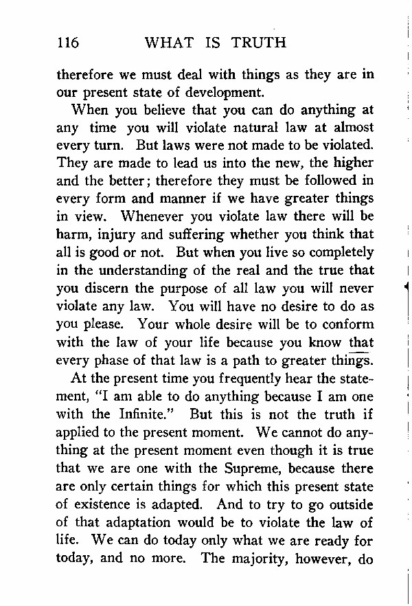 At the present time you frequently hear the statement, "I am able to do anything because I am one with the Infinite." But this is not the truth if applied to the present moment. We cannot do anything at the present moment even though it is true that we are one with the Supreme, because there are only certain things for which this present state of existence is adapted. And to try to go outside of that adaptation would be to violate the law of life. We can do today only what we are ready for today, and no more. The majority, however, do