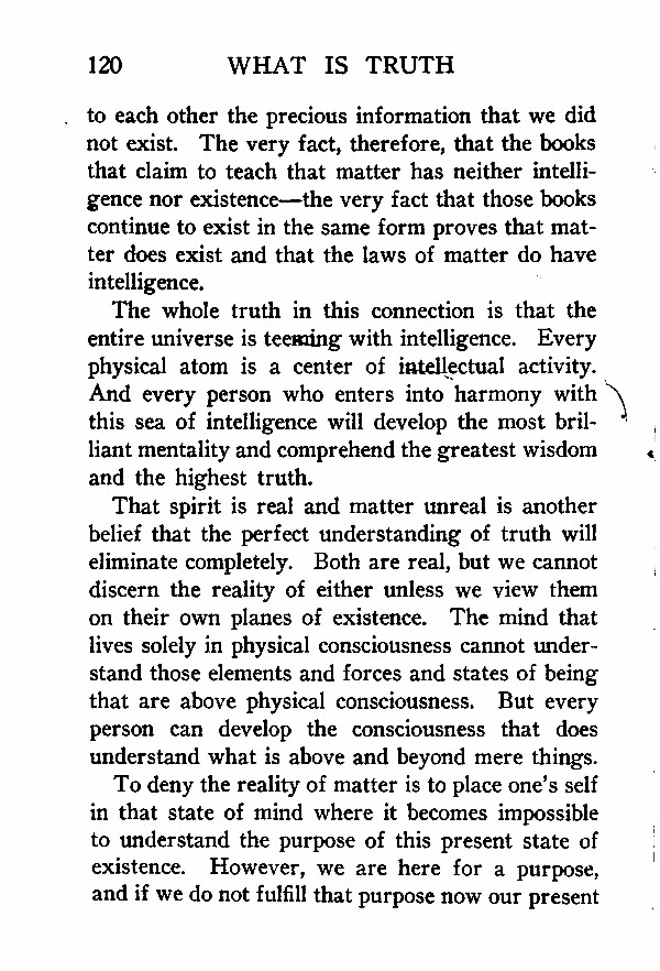 to each other the precious information that we did not exist. The very fact, therefore, that the books that claim to teach that matter has neither intelligence nor existence --- the very fact that those books continue to exist in the same form proves that matter does exist and that the laws of matter do have intelligence.