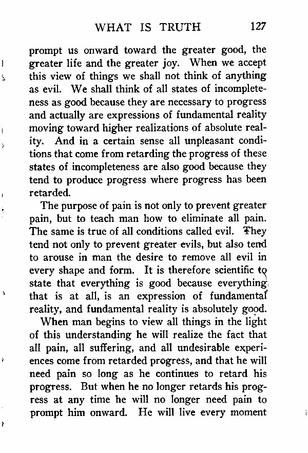 prompt us onward toward the greater good, the greater life and the greater joy. When we accept this view of things we shall not think of anything as evil. We shall think of all states of incompleteness as good because they are necessary to progress and actually are expressions of fundamental reality moving toward higher realizations of absolute reality. And in a certain sense all unpleasant conditions that come from retarding the progress of these states of incompleteness are also good because they tend to produce progress where progress has been retarded.