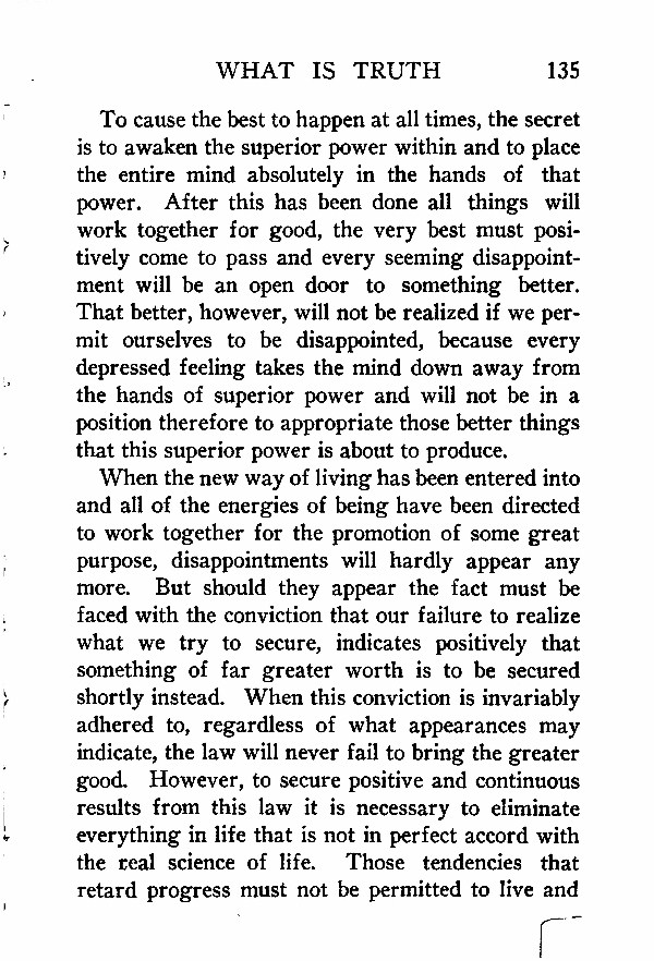 When the new way of living has been entered into and all of the energies of being have been directed to work together for the promotion of some great purpose, disappointments will hardly appear any more. But should they appear the fact must be faced with the conviction that our failure to realize what we try to secure, indicates positively that something of far greater worth is to be secured shortly instead. When this conviction is invariably adhered to, regardless of what appearances may indicate, the law will never fail to bring the greater good. However, to secure positive and continuous results from this law it is necessary to eliminate everything in life that is not in perfect accord with the real science of life. Those tendencies that retard progress must not be permitted to live and