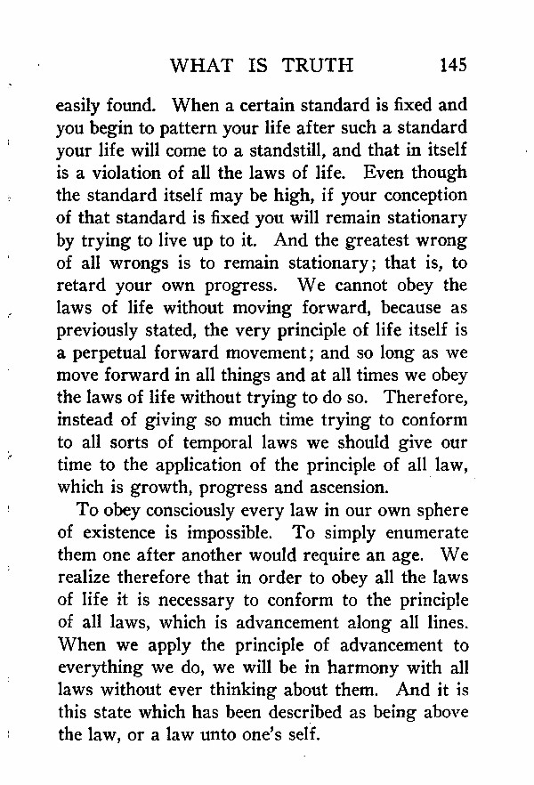 easily found. When a certain standard is fixed and you begin to pattern your life after such a standard your life will come to a standstill, and that in itself is a violation of all the laws of life. Even though the standard itself may be high, if your conception of that standard is fixed you will remain stationary by trying to live up to it. And the greatest wrong of all wrongs is to remain stationary; that is, to retard your own progress. We cannot obey the laws of life without moving forward, because as previously stated, the very principle of life itself is a perpetual forward movement; and so long as we move forward in all things and at all times we obey the laws of life without trying to do so. Therefore, instead of giving so much time trying to conform to all sorts of temporal laws we should give our time to the application of the principle of all law, which is growth, progress and ascension.