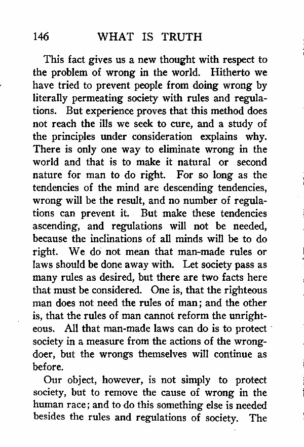 This fact gives us a new thought with respect to the problem of wrong in the world. Hitherto we have tried to prevent people from doing wrong by literally permeating society with rules and regulations. But experience proves that this method does not reach the ills we seek to cure, and a study of the principles under consideration explains why. There is only one way to eliminate wrong in the world and that is to make it natural or second nature for man to do right. For so long as the tendencies of the mind are descending tendencies, wrong will be the result, and no number of regulations can prevent it. But make these tendencies ascending, and regulations will not be needed, because the inclinations of all minds will be to do right. We do not mean that man-made rules or laws should be done away with. Let society pass as many rules as desired, but there are two facts here that must be considered. One is, that the righteous man does not need the rules of man; and the other is, that the rules of man cannot reform the unrighteous. All that man-made laws can do is to protect society in a measure from the actions of the wrongdoer, but the wrongs themselves will continue as before.