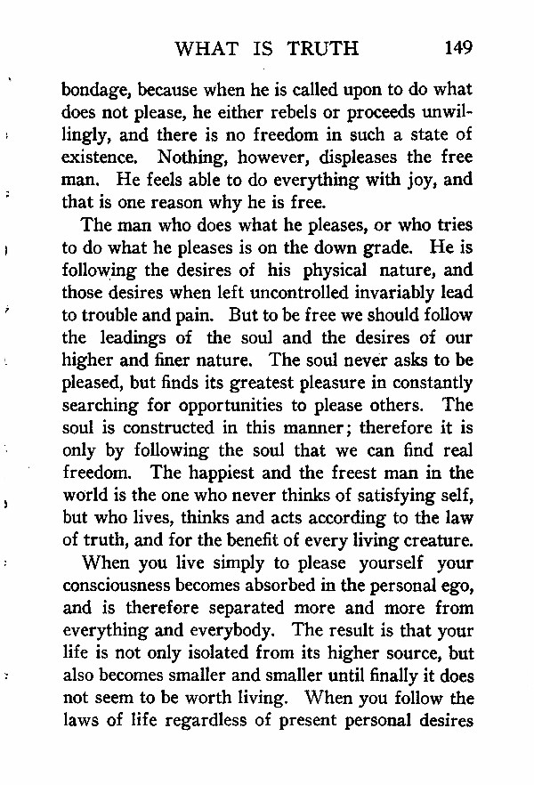 The man who does what he pleases, or who tries to do what he pleases is on the down grade. He is following the desires of his physical nature, and those desires when left uncontrolled invariably lead to trouble and pain. But to be free we should follow the leadings of the soul and the desires of our higher and finer nature. The soul never asks to be pleased, but finds its greatest pleasure in constantly searching for opportunities to please others. The soul is constructed in this manner; therefore it is only by following the soul that we can find real freedom. The happiest and the freest man in the world is the one who never thinks of satisfying self, but who lives, thinks and acts according to the law of truth, and for the benefit of every living creature.