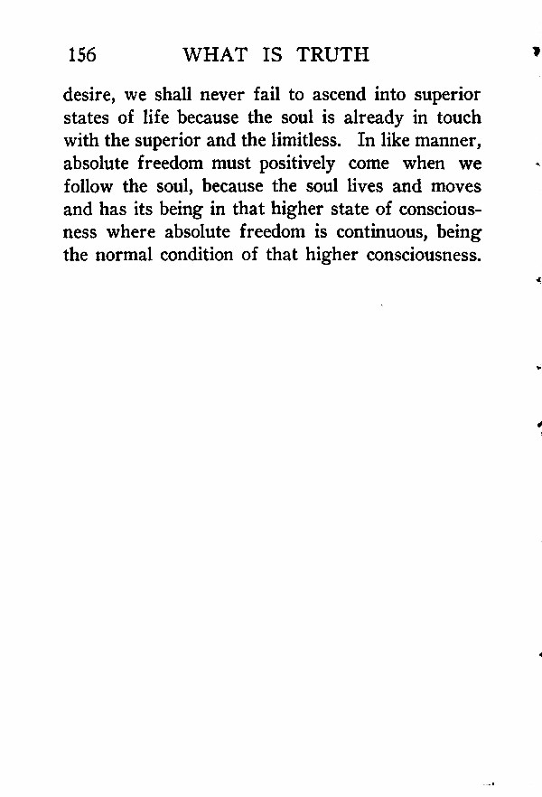 desire, we shall never fail to ascend into superior states of life because the soul is already in touch with the superior and the limitless. In like manner, absolute freedom must positively come when we follow the soul, because the soul lives and moves and has its being in that higher state of consciousness where absolute freedom is continuous, being the normal condition of that higher consciousness.