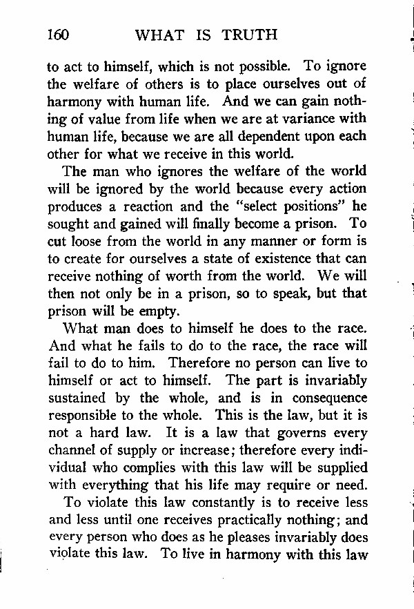 What man does to himself he does to the race. And what he fails to do to the race, the race will fail to do to him. Therefore no person can live to himself or act to himself. The part is invariably sustained by the whole, and is in consequence responsible to the whole. This is the law, but it is not a hard law. It is a law that governs every channel of supply or increase; therefore every individual who complies with this law will be supplied with everything that his life may require or need.