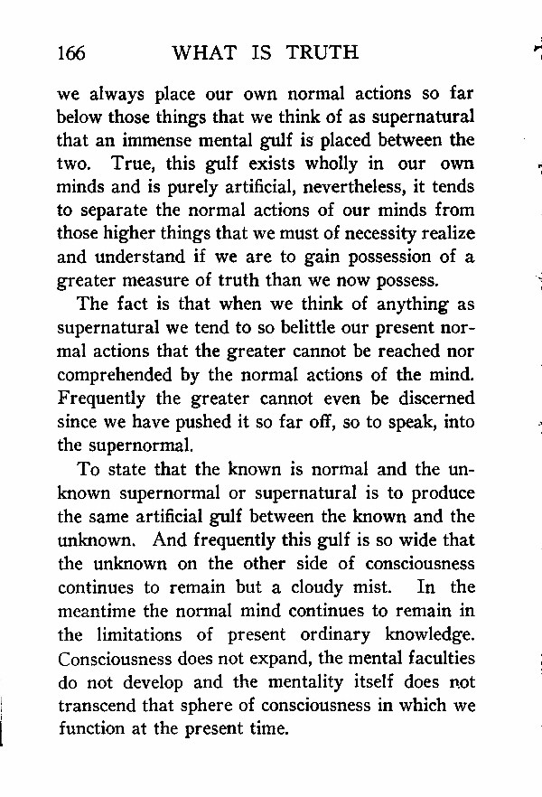 we always place our own normal actions so far below those things that we think of as supernatural that an immense mental gulf is placed between the two. True, this gulf exists wholly in our own minds and is purely artificial, nevertheless, it tends to separate the normal actions of our minds from those higher things that we must of necessity realize and understand if we are to gain possession of a greater measure of truth than we now possess.
