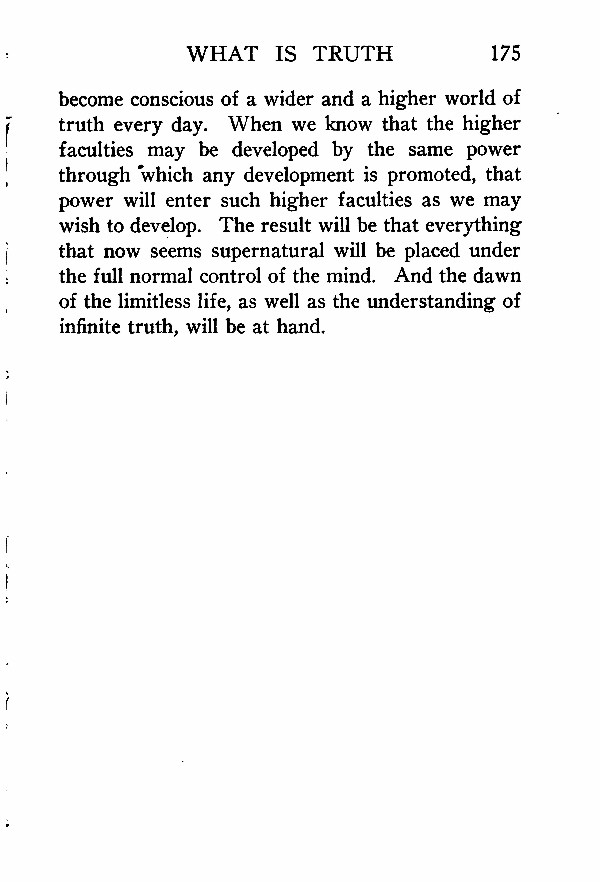 become conscious of a wider and a higher world of truth every day. When we know that the higher faculties may be developed by the same power through which any development is promoted, that power will enter such higher faculties as we may wish to develop. The result will be that everything that now seems supernatural will be placed under the full normal control of the mind. And the dawn of the limitless life, as well as the understanding of infinite truth, will be at hand.