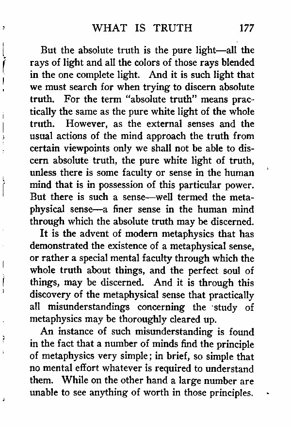 But the absolute truth is the pure light --- all the rays of light and all the colors of those rays blended in the one complete light. And it is such light that we must search for when trying to discern absolute truth. For the term "absolute truth" means practically the same as the pure white light of the whole truth. However, as the external senses and the usual actions of the mind approach the truth from certain viewpoints only we shall not be able to discern absolute truth, the pure white light of truth, unless there is some faculty or sense in the human mind that is in possession of this particular power. But there is such a sense --- well termed the metaphysical sense --- a finer sense in the human mind through which the absolute truth may be discerned.