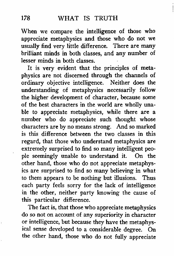 It is very evident that the principles of metaphysics are not discerned through the channels of ordinary objective intelligence. Neither does the understanding of metaphysics necessarily follow the higher development of character, because some of the best characters in the world are wholly unable to appreciate metaphysics, while there are a number who do appreciate such thought whose characters are by no means strong. And so marked is this difference between the two classes in this regard, that those who understand metaphysics are extremely surprised to find so many intelligent people seemingly unable to understand it. On the other hand, those who do not appreciate metaphysics are surprised to find so many believing in what to them appears to be nothing but illusions. Thus each party feels sorry for the lack of intelligence in the other, neither party knowing the cause of this particular difference.
