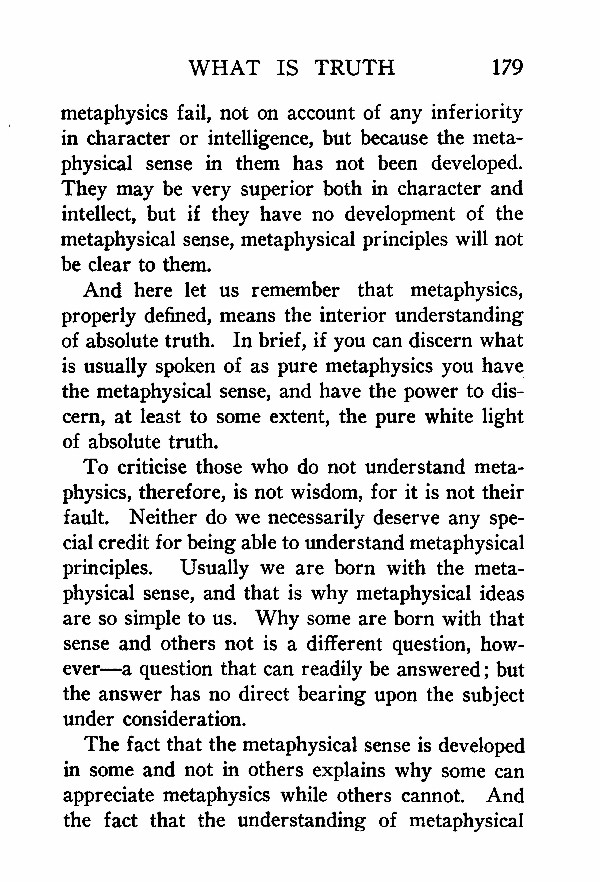 And here let us remember that metaphysics, properly defined, means the interior understanding of absolute truth. In brief, if you can discern what is usually spoken of as pure metaphysics you have the metaphysical sense, and have the power to discern, at least to some extent, the pure white light of absolute truth.