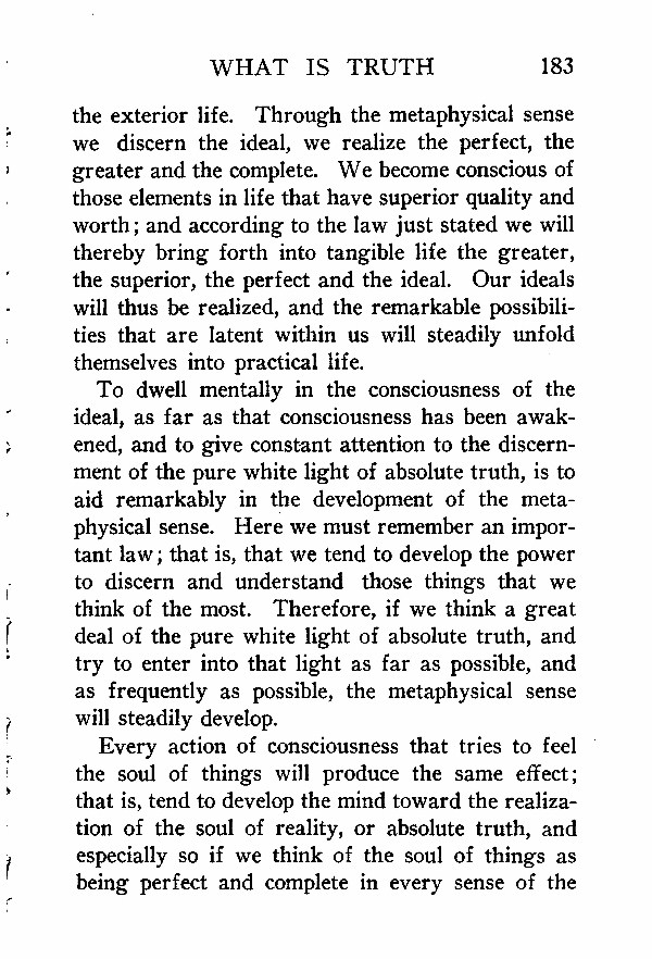 To dwell mentally in the consciousness of the ideal, as far as that consciousness has been awakened, and to give constant attention to the discernment of the pure white light of absolute truth, is to aid remarkably in the development of the metaphysical sense. Here we must remember an important law; that is, that we tend to develop the power to discern and understand those things that we think of the most. Therefore, if we think a great deal of the pure white light of absolute truth, and try to enter into that light as far as possible, and as frequently as possible, the metaphysical sense will steadily develop.