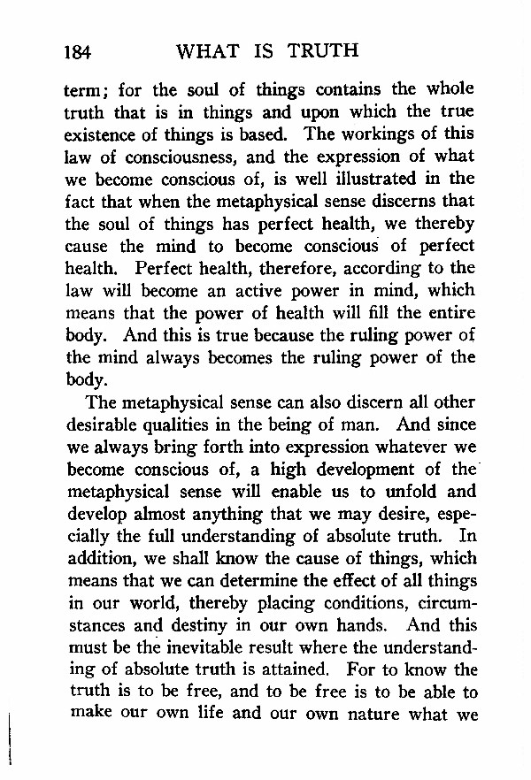 The metaphysical sense can also discern all other desirable qualities in the being of man. And since we always bring forth into expression whatever we become conscious of, a high development of the metaphysical sense will enable us to unfold and develop almost anything that we may desire, especially the full understanding of absolute truth. In addition, we shall know the cause of things, which means that we can determine the effect of all things in our world, thereby placing conditions, circumstances and destiny in our own hands. And this must be the inevitable result where the understanding of absolute truth is attained. For to know the truth is to be free, and to be free is to be able to make our own life and our own nature what we