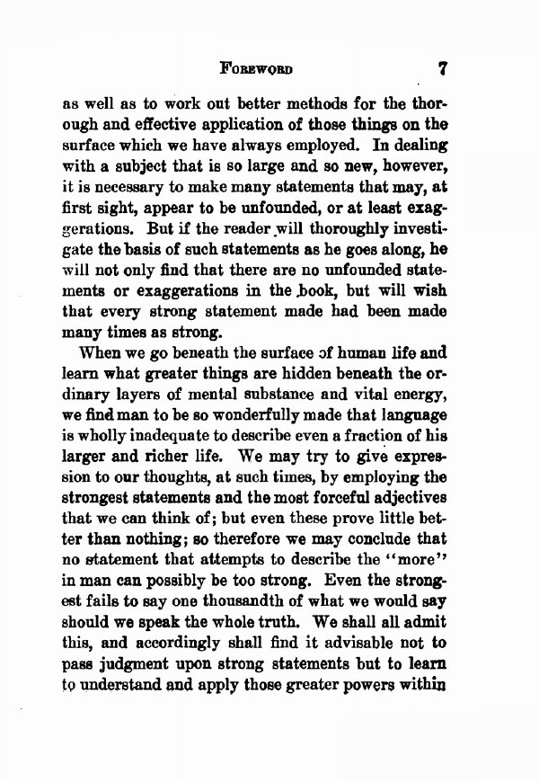 When we go beneath the surface of human life and learn what greater things are hidden beneath the ordinary layers of mental substance and vital energy, we find man to be so wonderfully made that language is wholly inadequate to describe even a fraction of his larger and richer life. We may try to give expression to our thoughts, at such times, by employing the strongest statements and the most forceful adjectives that we can think of; but even these prove little better than nothing; so therefore we may conclude that no statement that attempts to describe the "more" in man can possibly be too strong. Even the strongest fails to say one thousandth of what we would say should we speak the whole truth. We shall all admit this, and accordingly shall find it advisable not to pass judgment upon strong statements but to learn to understand and apply those greater powers within